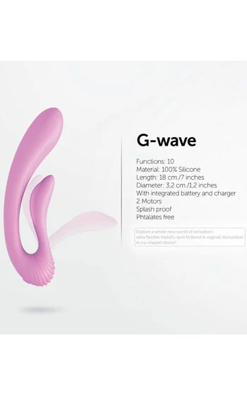 Beskrivning: U-formad vibrator för dubbel njutning! G-Wave stimulerar både utanpå och inuti samtidigt och kan dessutom användas under sex. Den kortare delen är mycket flexibel för att passa alla olika tillfällen, se t.ex. under extrabilder. Denna exceptionellt mångsidiga vibrator drivs av två enskilda och starka motorer som med alla sina möjliga vinklar låter dig experimentera fram maximal njutning! Vibratorerna är tysta har tio olika lägen. Supermjukt silikon och uppladdningsbart batteri. Laddare för USB samt förvaringspåse ingår. Vibratorn startas genom att du håller knappen intryckt i 3-4 sekunder.