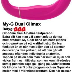Luftvibratorn för klitoris har 9 olika program och en G-punkts motor med 7 vibrationsprogram. Den här passar den som vill ha kraftfull stimulering både utanpå och inuti, personligen tycker jag den är för stor och går för djupt in i vaginan, men den som gillar djup penetrering kommer förmodligen älska My G. Något dyr för min smak.”