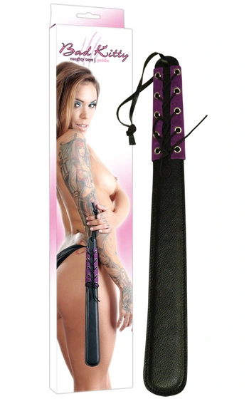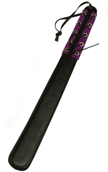 Beskrivning: Svart flerskiktspaddel med mjukt lila handtag och snygga detaljer. Paddeln har en söm utmed kanterna som håller samman de olika lagren för att tåla även de tuffaste snärtarna. Totalt är paddeln 3 lager tjock, baksidan erbjuder läder direkt mot det hårda innanmätet vilket ger mest smärta/märke. Framsidan är mjukt vadderad mellan den hårda mitten och det yttre lädret för lite snällare piskrapp. Handtaget är av mjuk mocka med snygg snörning. I toppen av paddeln finns en häng-ögla som får din partner att inse vad denne gett sig in på så snart han eller hon äntrar sängkammaren.