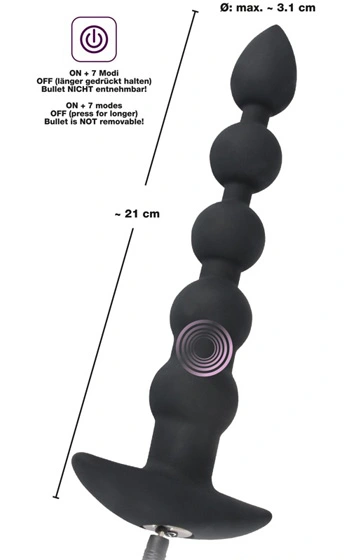 Beskrivning: Uppfyll dina anala fantasier med denna långa, sköna och fantastiskt mjuka analvibrator beståendes av fem kulor samt en kraftfull vibrator – alltsammans med överdrag av mjukt silikon.