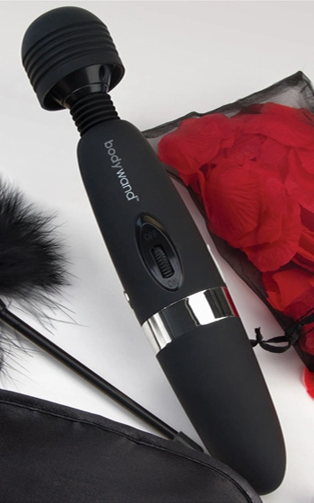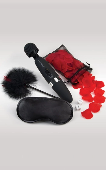 Beskrivning: Härlig presentbox med ögonbindel, sextärningar, rosenblad, kittlare samt en Bodywand Uppladdningsbar Massager. Det perfekta paketet när du vill överraska din partner med en fulländad helg.