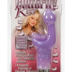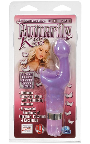Beskrivning: Platinum Edition med 9 olika funktioner! Uppdaterad version av den otroligt populära fjärilen som alltid får höga betyg i alla tester. Butterfly Kiss är en kombinerad klitoris och G-punktsvibrator. Platinum Edition har 9 olika vibrationslägen (bl.a eskalerande och pulserande) som enkelt styrs via knappen i botten. Mycket mjuk och följsam i materialet gör denna populära fjäril till en solklar vinnare.