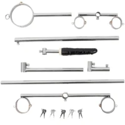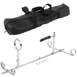 Beskrivning: Fixera din undergivna partner knästående i doggystyle, med denna häftiga och väldigt kinky ”möbel” av rostfritt stål. Röret i mitten som är själva huvudröret och kopplar samman delarna kan justeras mellan 65-117 cm på längden.
