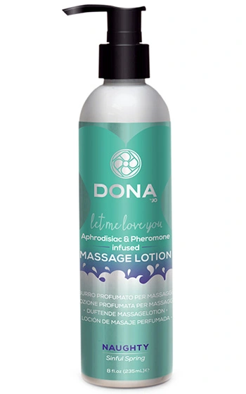 Beskrivning: Amerikanska Dona är ett högkvalitativt märke med erotiska massageprodukter av absolut högsta kvalitet. Här är den nya flaskan av Donas omåttligt populära massage lotion. Smart pumpflaska som låter din pumpa fram lotion för att sedan smörja in och massera dig eller din partner. Produkten är återfuktande och gör din hud silkeslen. Ge dina sinnen en orgasm med denna lotion som doftar frisk vårvind. Massage lotion är afrodisiaka och innehåller feromoner som får din sexlust att tända till. Produkten kan även användas som bodylotion överallt på kroppen.