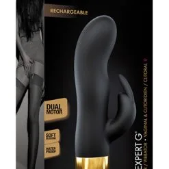 De båda motorerna körs tillsammans och erbjuder dig tio olika vibrations-program. Rabbit Expert G har ett skönt yttre av svart silikon, som ger ett lyxigt intryck i kombination med den guldfärgade botten. Kroppen är böjlig för att anpassa sig efter just din insida. Uppladdningsbar, helt vattentät och levereras tillsammans med en förvaringspåse av tyg. Hela Rabbit Expert G utstrålar glamour och kvalitet, och den presenteras i en snygg förpackning – perfekt som födelsedagspresent eller julklapp till någon du tycker om!