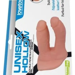 Beskrivning: Ihålig strap-on som penetrerar både rumpa och mus på henne. Produkten är helt styv i materialet. Den större av de två dildosarna är ihålig för att du som man ska kunna ha din penis i slakt tillstånd i den. Den ihåliga dildon är 2,5 cm i inre diameter samt 10 cm djup. Ljust hudfärgad med realistisk ådring.