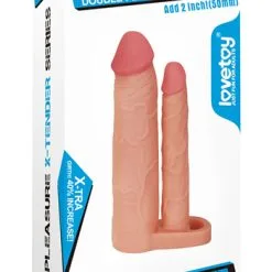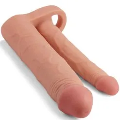 Beskrivning: Penisöverdrag av kvalitativt material som ger din penis extra storlek, samtidigt som du även ger din partner en skön dubbelmacka tack vare den mindre dildon undertill. Hela produkten är gjord av det hudlika materialet TPE, samt har detaljer som ådring och ollon som ökar det realistiska intrycket.