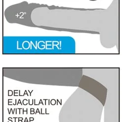 Den större och ihåliga av de två dildosarna är 16 cm lång, och låter dig föra in din penis 14,5 cm i den. Innerdiametern på sleeven för din penis är 2,5 cm, samt töjbart för att kunna användas även av dig som är större. Överdraget ger 2 cm extra på längden och 3,7 cm extra i omkrets. Den mindre av de två dildona för rumpan är 13 cm lång och är drygt 8 cm i omkrets, en perfekt storlek även för nybörjaren.