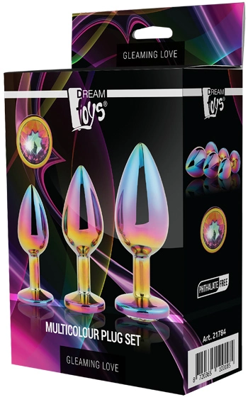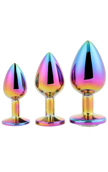 Beskrivning: Trepack analpluggar i storlekarna small, medium och large. Riktigt snygg färgsättning som skimrar likt regnbågen i högblankt stål, samt med en snygg ädelsten i botten. Tre förvaringspåsar av tyg medföljer för att hålla pluggarna damm och rep-fria när dem inte används. Pluggarna kan även läggas i kallt eller varmt vatten för att ge dig ökad känsla i de känsliga nervtrådarna där bak.