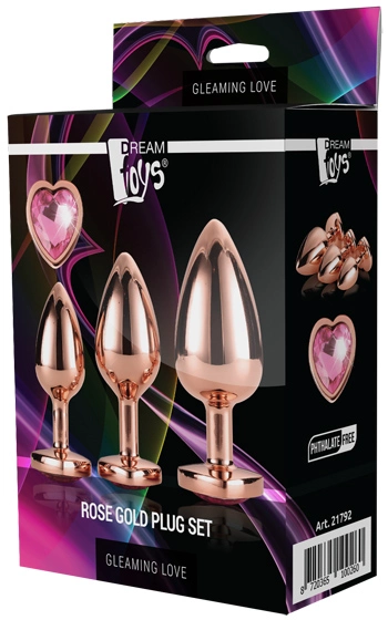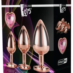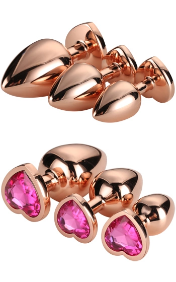 Beskrivning: Vackert dekorerade analpluggar där du slipper kompromissa eller chansa med att välja storlek. Här får du en trio i olika storlekar. Glittrande snygga ädelstenar formade som hjärtan i botten, kombinerat med högblank yta av roséguld på själva pluggarna ger dem ett utseende likt ett smycke.