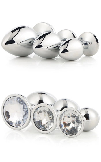 Beskrivning: Dekorera rumpan och gör hela din bakdel extra inbjudande och stilig! Här får du tre analpluggar med snyggt glittrande stenar i olika storlekar, idealiskt för gradvis storleksökning. Den koniska formen hos pluggarna förenklar införandet. Samtliga pluggar är även inspirerade från smyckesvärlden med sina snygga kristaller i botten.