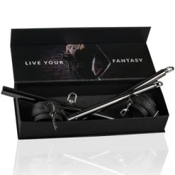 Beskrivning: Begränsa din partners rörelse av händer eller fötter. Denna spreader bar har sköna fängsel av konstläder med justerbara lås likt ett vanligt bälte. Vadderad insida för en skönare känsla kring fot eller handleder. Röret är justerbart i tre olika längder 70-96 cm samt har fjäderbelastade snabbfästen för att justera längden. Bojorna sitter fast i en hake i var ända, vilket också finns på mitten för sammankoppling med exempelvis ett halsband.