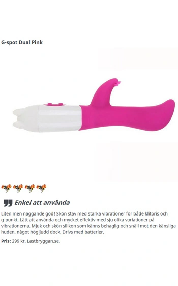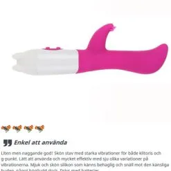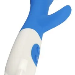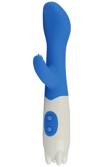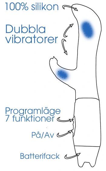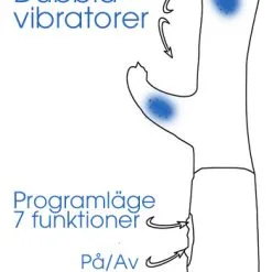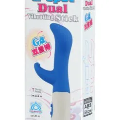 Beskrivning: G-Spot Dual Blue är en underbar liten rabbitstav med dubbla intensiva vibratorer. Den har en sagolikt mjuk och skön finish. En vibrator sitter i den knubbiga toppen och den andra sitter i klitoris-stimulatorn. G-Spot Dual Blue styrs enkelt via två knappar. Med den understa knappen startas vibratorerna och med den översta styrs vibrationsprogrammen i hela sju sköna lägen. G-Spot Dual Blue är tillverkad i silikon av absolut högsta kvalitet, den tål lättare vattenstänk och trots starka vibrationer är den mycket tyst.