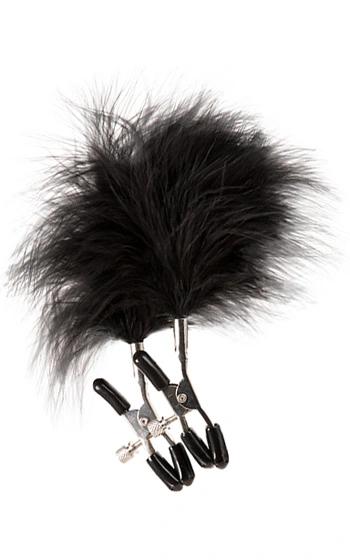 Beskrivning: Fjädrade bröstklämmor! Nyp åt din partners eller dina egna bröstvårtor och känn en smärtande njutning i kombination med en lätt kittling under brösten. Modellens fluffiga syntetfjädrar kan även användas utan själva klämmorna och då till kärleksfulla och försiktiga smek över exempelvis ryggen. Klämmorna och ställskruvarna för hårdheten på nypet är av kvalitativ metall, överdrag av gummi finns längst ut i topparna.