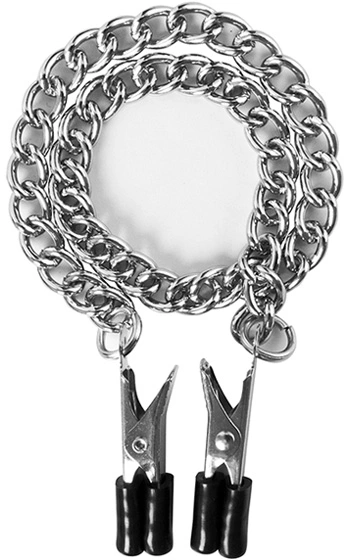 Beskrivning: Lite längre klämmor av kromad metall med en tuff högblank kedja. På denna modell finns ingen möjlighet att bestämma hårdheten, här är det fullt ös med en gång som gäller. Nypet kan dock till viss del väljas beroende på hur långt in du låter klämmorna nypa åt. Dekorativt och väldigt sexuellt tändande att se din partners bröstvårtor svullna upp lite extra.