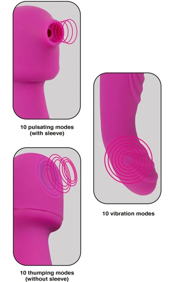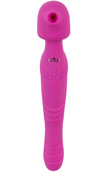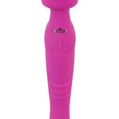 Beskrivning: Härlig produkt som fungerar både som en klassisk wand för helkroppsmassage och även har en öppning i huvudet med härliga lufttrycksvibrationer. Vänd på den och handtaget fungerar som en vibrerande G-punktstav att penetrera med!
