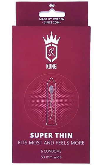 Beskrivning: Svenska märket Kung presenterar här kondomen Super Thin – 35% tunnare än andra kondomer! Tekniken inom kondomer går ständigt framåt och Kung är självklart inte sena att hänga med. Tycker du att känseln blir nedsatt, eller att det är obekvämt att bära kondom för att få komma intill? Problemet är nu ur världen, om du väljer denna kondom.