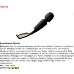 Beskrivning: Lelo är stolta över att kunna presentera uppgraderingen till testvinnande Smart Wand Medium, som är en av världens bästa trådlösa massageapparater. Smart Wand 2 tar verkligen orden prestanda och design till helt nya höjder. Helt vattentät, utan sladd och dessutom uppladdningsbar. Trots batteridrift av dess inbyggda batterier levererar den väldigt kraftfull men samtidigt diskret prestanda. Lelo’s produkter är kända för sin höga kvalitet, men också för att de kan användas och tas med överallt och samtidigt hålla måttet – duschen, badet, på resan eller vid valfritt nöje.