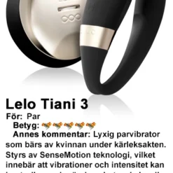 Beskrivning: Tiani 2 Design Edition är en uppgraderade versionen av Lelo’s tidigare, prisbelönta pavibrator Tiani. Produkten är utformad för att bäras av henne under tiden ni har sex. LELOs unika SenseMotion teknologi gör det möjligt för användare att styra dess funktioner under akten genom fjärrkontrollen. Flera förbättringar såsom 50% mer kraftfull motor. Helt vattentätt för enkel rengöring och möjligheten till lek i badkar och dusch. Tiani 2 kan även styras utan fjärrkontrollen. Lelo har med denna produkt satt en ny världs-standard för dagens massageapparater för par.