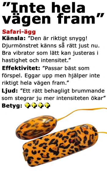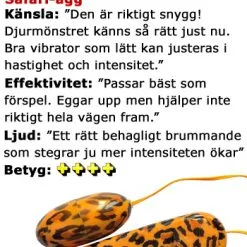 Beskrivning: Mycket kraftfullt och läckert leopardmönstrat ägg med ett smart rullhjul framtill på kontrollen som låter dig finjustera vibrationerna till perfektion. Safariägget fick fyra plus i ett av Aftonbladets stora test av sexleksaker. Ägget har en lång sladd på ca 60 cm som gör det möjligt både att ha kontrollen i fickan samtidigt som du har ägget i dig, eller att du låter din partner sköta vibrationerna bredvid dig i sängen. Safariägget har en tyst vibrationsvolym även på högsta läget vilket gör det till ett självklart val om du är på jakt efter ett vibrerande ägg. Leopardmönstrade samt lila sexleksaker är de mest populära och uppskattade färgerna bland våra kunder.