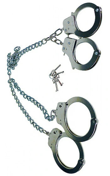 Beskrivning: Metal Wrist & Ankle Cuffs är riktigt gedigna hand och fotbojor med en lång kedja som sammanbinder dem. Kalla, hårda och tunga hand- och fotbojor som får din partner att stanna där du sätter henne/honom. Med detta fängselset fängslar du din partner ordentligt. Både dina händer och dina fötter sitter fast i kedjan som sammanbinder fängslen. Välj mellan att ha händerna framför eller bakom ryggen. Väljer ni att sätta fast händerna bakom ryggen blir din partner än mer underlägsen. Mycket hög kvalitet till ett lågt pris.