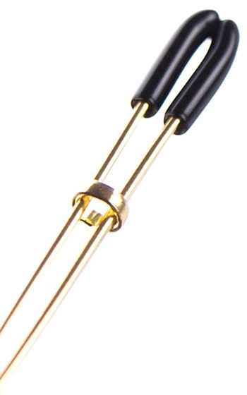 Beskrivning: Bröstklämmor i snyggt utförande som verkligen nyper åt dina känsliga bröstvårtor och ger dig smärtsam njutning. Placera de gummiklädda topparna på var sida om bröstvårtan, drag sedan ringen uppåt så långt du klarar av för att nypa ihop och sätta fast klämman. Snygga hängen i guld, dekorerade med svarta stenar som ger ett lyxigt intryck.