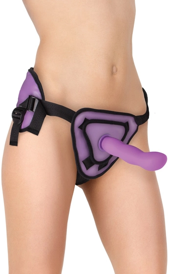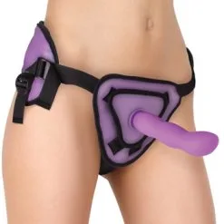 Beskrivning: Justerbar strap-on sele som ställs in i storlek vid höften för bästa passform oavsett om du är storlek small, extralarge eller nånstans mittemellan. Selen har mjukt vadderad insida som gör den bekväm att bära även under längre stunder. Tillsammans med selen medföljer även en lila dildo som monteras framtill och har en total längd på 20,5 cm.