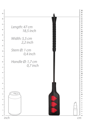 Beskrivning: Det perfekta sättet att disciplinera din partner. Piskan i ridspö-utförande pryds av tre lekfulla hjärtan som är utskurna ur konstlädret, för att ge kärleksfulla avtryck på exempelvis din partners skinka. Något längre, stabil piska med greppvänligt handtag. I underkant av spöet finns även en rem för handleden.