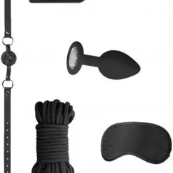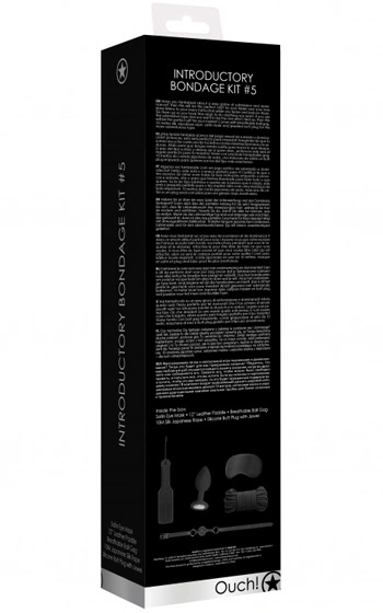 Beskrivning: Har du fantiserat om lekar med din partner av lite tuffare slag? Med detta introduktionskit till bondage får du fem olika, spännande delar som egentligen allt som behövs för att utöva lite dominans. Bind fast din partner, montera ögonbindeln och pröva den smärtsamma paddeln mot skinkorna, röda märken utlovas! I kitet ingår även en gag-ball som begränsar din partners tal, samt en mindre analplugg för nybörjaren med skimrande sten i botten.