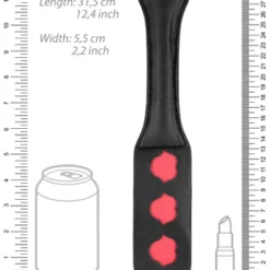Beskrivning: Förförisk paddel i läderutseende som passar perfekt både för nybörjaren och den vana bondage-användaren. Oavsett om du är undergiven eller dominerande, ger paddeln dig ett nytt syndigt straff i form av tre kyssande läppar på huden. Stabilt och lagom smalt handtag som ligger bra i handen hos både henne och honom. Upplev en kombo där smärta och stimulans jobbar som hand i hand – samtidigt!