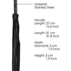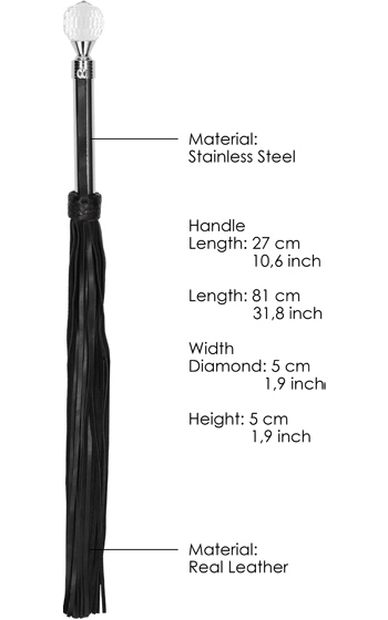 Handtaget är 20 cm långt och tillverkat av metall, vilket i kombination med det kvalitativa lädret och den tunga stenen gör att den väger imponerande 500 gram. Läderremmarna är ca 55 cm och sitter ordentligt fast i handtaget med ett snyggt, flätat läderfäste. Sparkling Metal Whip är ett mycket bra komplement till din BDSM-samling. Låt dina djuriska lustar springa fritt och ha kul med en riktigt snygg piska – om och om igen.