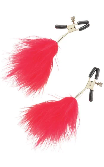 Beskrivning: Piffa upp dina bröstvårtor och fyll fäst dessa läckra bröstklämmor med rött fluff. Klämmorna justeras för att kunna sitta löst, mellanhårt eller klämma ordentligt. Klämmorna är tillverkade av slitstark metall och täckta av mjukt gummi i toppen, gummit kan plockas av om du söker smärtsam njutning. Perfekt för nybörjaren eller fantasten av fetisch.