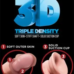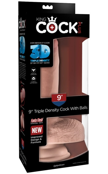 Beskrivning: Senaste nytt ur amerikanska serien Pipedream King Cock är produkterna Triple Density. En serie verklighetstrogna dildos som alla har flera lager silikongummi i olika hårdhet, för en ultra-realistisk känsla. Känn känslan av en riktig penis, utan att ha en man till hands! Detaljer och textur hos denna dildo är utöver det vanliga, för en känsla som är 100%-ig varje gång. Dildon är gjord i tre lager, där den innersta är en fast kärna, den mittersta är något mjukare och den yttersta supermjuk som riktig människohud. Detta skapar känslan och flexibiliteten som hos en riktig erigerad penis.