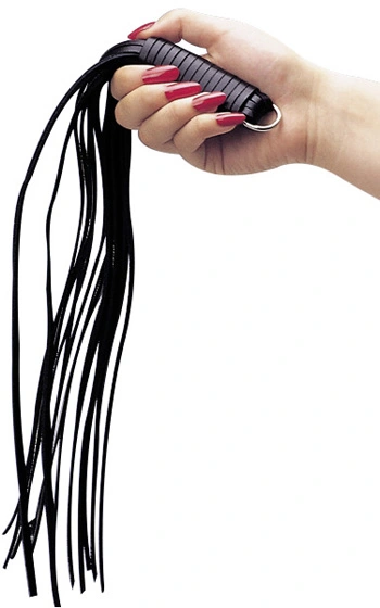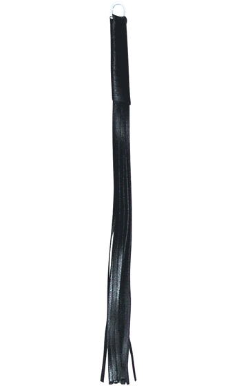 Beskrivning: Läderpiska med lindat handtag på totalt 45 cm med metallögla i skaftet. Spännande leksak av bra kvalitet för dig som är nyfiken på bondage.