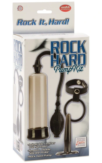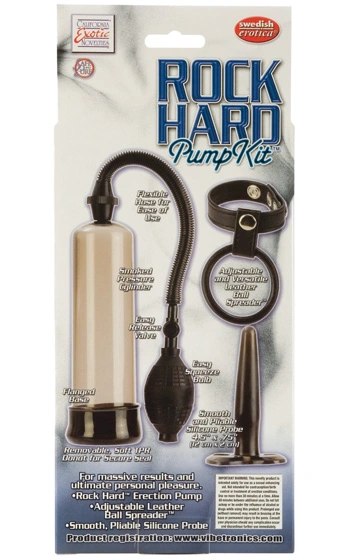 Beskrivning: Prisvärt paket av hög kvalitet som innehåller en transparent potenspump, en justerbar potensring i läder och en styv analplugg av mindre modell.