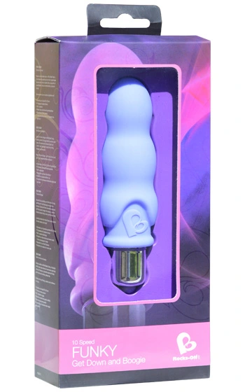 Beskrivning: Helt vattentät vibrator som är baserad på den populära ro-120 mm från Rocks Off. Vibratorn har ett snyggt och mjukt överdrag av lila silikon som ger staven dess karaktär och sköna känsla. Använd toppen som klitorisvibrator eller för in och njut av den medeltjocka omkretsen. Funky gör skäl för sitt namn med sitt lätt funkiga utseende.