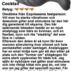 Båda produktens knappar hålls inne samtidigt för att starta produkten, tryck sedan på knapparna igen för att starta igång respektive funktion. Denna produkt har starka motorer och är samtidigt i princip ljudlös, det hörs knappt alls att den är igång. Pluggen är 7 cm lång (8,5 cm med hals), 3,2 cm diameter. Böjbar hals, lätt skruvad struktur. Delen för vaginan är 5,5 cm lång, 1,7 cm diameter i början och 3 cm som bredast vid vibratorn. 0,6-1 cm tjock. Ovansidan är strukturerad med små prickar som stimulerar undersidan av mannen penis. Även denna del är fullt flexibel.