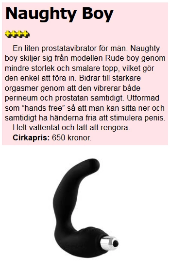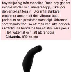 Det som är unikt med Naughty Boy är storleken, betydligt smalare topp som gör den väldigt enkel att föra in, toppen är ungefär stor som ett lillfinger. Så om du inte gillar känslan av att bli utfylld där bak men samtidigt vill uppleva de starka orgasmer man får av stimulans av prostatan så är detta den perfekta leksaken för dig. Njut av intensiva vibrationer samtidigt till båda perineum och prostatan för omskakande orgasmer. Naughty Boy är designad för ’hands free’ action, sitt och rocka dig till orgasm. Naughty Boy är 100% vattentätt så ta gärna med den i badkaret. En helt otroligt stark upplevelse, som du kommer vilja återuppleva varje dag.