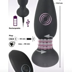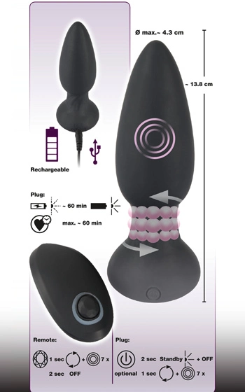 Beskrivning: Har du alltid undrat varför det inte finns någon analplugg med roterande kulor som stimulerar analöppningen? Förmodligen inte, men här är den iallafall! Troligtvis världens första analplugg som ser till att du får det skönt på flera olika sätt samtidigt. Klassiska pärlband som roterar nedtill, samtidigt som den övre delen av pluggen ger dig vibrationer i en otrolig styrka.