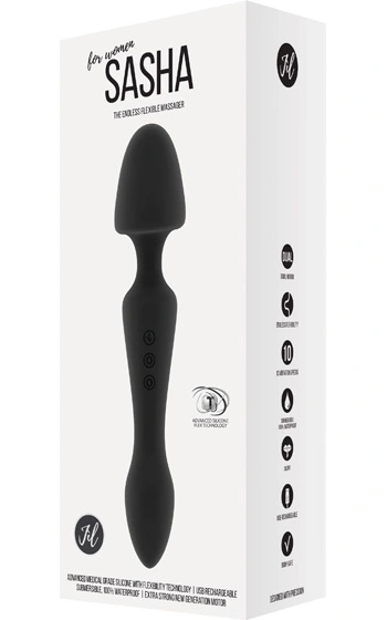 Beskrivning: Häftig och helt unik wand som funkar till så mycket mer än bara massage, från lyxmärket Jil. Vänd på Sasha och plötsligt har du en underbart skön, vibrerande massagestav att leka med vaginalt eller analt. Att produkten är fullt böjlig i alla positioner och dessutom helt vattentät gör knappast intresset mindre.