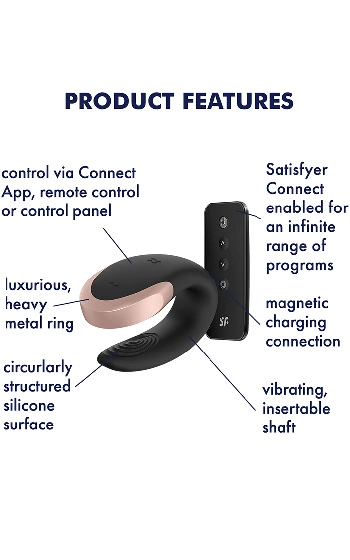 Till produkten medföljer en trådlös fjärrkontroll, om du inte vill använda Satisfyers högteknologiska app Satisfyer Connect i sänghalmen. Appen låter dig styra produkten på långt avstånd, samt göra dina egna vibrationsprogram. Satisfyer Connect är tillgänglig till iOS och Android.