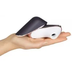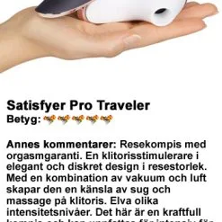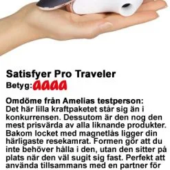 ”Det här lilla kraftpaketet står sig än i konkurrensen. Dessutom är den nog den mest prisvärda av alla liknande produkter. Bakom locket med magnetlås ligger din härligaste resekamrat. Formen gör att du inte behöver hålla i den, utan den sitter på plats när den väl sugit sig fast. Perfekt att använda tillsammans med en partner för handsfree njutning. Liten och diskret och hänger lätt med i handväskan eller necessären. 11 olika intensitetsnivåer gör att den är mångsidig och passar både den som vill ha lättare stimulering till tuffare intensitet.”