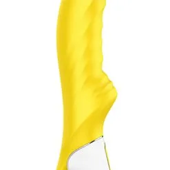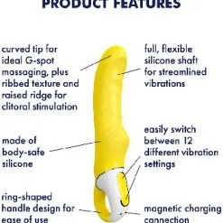 Beskrivning: Riktigt snygg massagestav från populära märket Satisfyer, i en knallgul färg och av härligt mjukt silikon. Tolv olika vibrationsprogram som erbjuder dig 6 fasta lägen samt 6 olika vibrationsmönster. Denna modell är väldigt prisvärd och har likvärdiga egenskaper som betydligt dyrare stavar från andra märken.