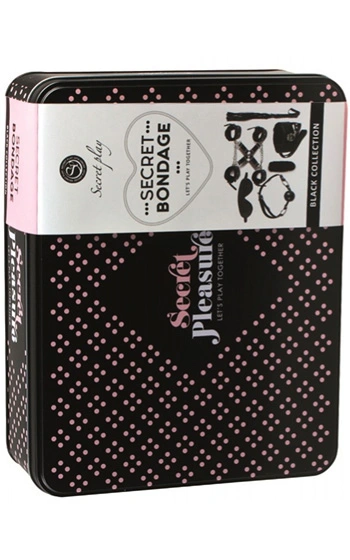 Beskrivning: Superfräckt bondagekit i tuff plåtask med alla delar du behöver för att kunna leva ut dina lustar med din partner. Uppsättningen av produkter består av bojor som kopplar samman händer och fötter, bondagerep, piska, ögonbindel, gagball och halsfängsel med koppel. Här hittar du alla delar du behöver för roliga stunder med fin partner framöver!