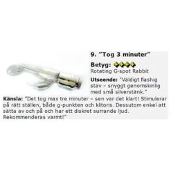 Beskrivning: Rotating G-Spot Rabbit är en rabbitstav som tack vare dubbla motorer och roterande topp stimulerar din G-punkt och klitoris till max. Garanterad njutning med denna högkvalitativa stav som fick fyra plus i ett av aftonbladets stora sexleksakstest. Läcker transparent och mjuk jelly med inslag av glitter.