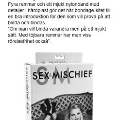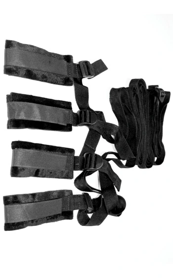 Beskrivning: Gör sängen till en plats för bindande nöje. Detta set av mycket hög kvalitet innehåller kraftiga mjuka handfängsel och band med fasthållningsanordningar. Du får dem snabbt på plats och de passar under de flesta madrasser eller ramar. Begränsa din partners armar och ben från sidan eller upp och ned i sängen, bara din fantasi sätter gränserna. Inkluderar 4 fängsel och remmar. Mycket bra kvalitet från amerikanska Sportsheets.