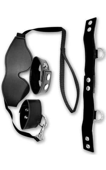 Beskrivning: Ett läckert kit i fräckt svart som innehåller ett par fängsel i läderimitation, en ögonmask i läderimitation, ett nylonkoppel med tillhörande halsband. Mycket bra kvalitet från amerikanska Sportsheets.