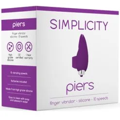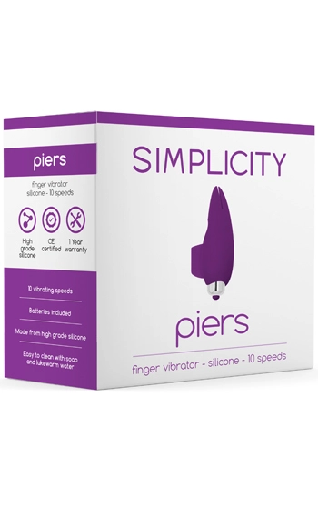 Beskrivning: Häftig, skön och ergonomiskt formad fingervibrator som är gjord av mjukaste silikon. Produkten kommer ur den nya serien Simplicity, lite lyxigare produkter som ändå är i enkelt utförande och i en medelmåttig prisklass. Dess 2 cm långa öron är fullt flexibla för att kittla din klitoris maximalt. Öronen kan strykas fram och tillbaka, eller placeras på varsin sida om din klitoris. Piers Fingervibe erbjuder 10 spännande vibrationslägen där du kan välja mellan både fasta, pulserande och eskalerande lägen. Vibratorn har en trots sin styrka en väldigt låg ljudnivå (max 60dB). En verkligt diskret vibrator som inte bara är en fest för ögat, utan även för din njutning. En uppsättning batterier ingår i förpackningen utan extra kostnad.