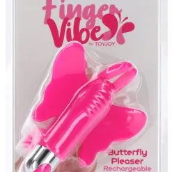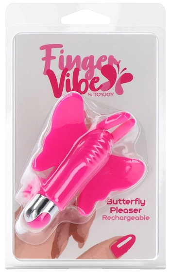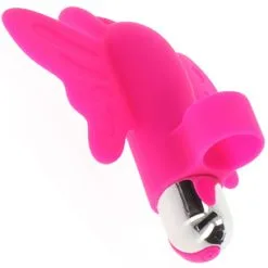 Beskrivning: Den omåttligt populära fingervibratorn presenteras här som en rosa fjäril med sköna vingar som gärna omsluter din vagina! Vibratorn som främst är avsedd för klitorisstimulans monteras på ditt eller din partners finger. Den löstagbara minivibratorn har tre fasta lägen i olika styrkor, samt sju olika vibrationsprogram, totalt 10 funktioner. Fingervibratorns motor sitter högst upp i toppen för att leverera intensiv njutning med sina två mjuka spröt.