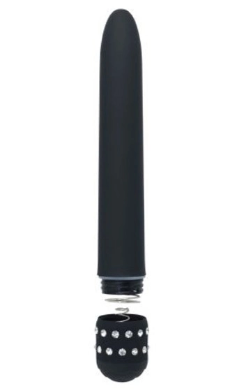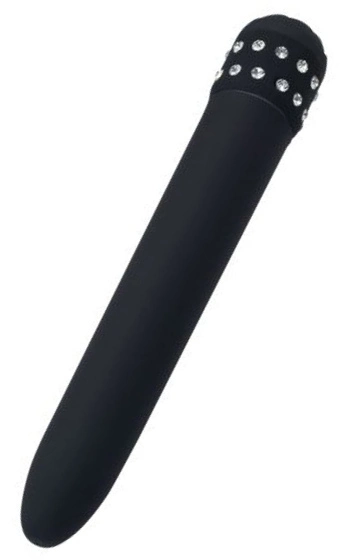 Beskrivning: Här får du en medelstor modell av den klassiskt släta vibratorn, i den populära kombon svart med dekorationsstenar kring batterilocket. Helgjuten modell utan skavande skarvar, som dessutom är extra len på ytan. Lyxigt utseende med en vibrationskraft som knappast gör dig besviken. Steglöst ställbara vibrationer efter just dina önskemål. Motorn sitter högst upp i toppen för precisa och djupa vibrationer oavsett om du väljer att ha den inuti eller utanpå kroppen.
